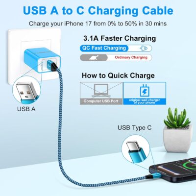 for iPhone 17 Pro Max Car Charger Cable iPhone 17 Charging Cord Carplay Cord for iPhone 17 Pro Air 17e 16e 16 15 Pro Max/Plus 16, 3FT 2Pack 3.1A USB A to USB C Cable Fast Charging for Samsung S26 S25