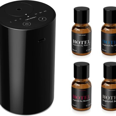 Airversa Waterless Essential Oil Diffuser Starter Kit with 4 x 10mL Hotel Scent Fragrance Oil, Battery Operated Mini Scent Air Machine Portable Diffuser for Home Car Office, AN8 Kit Black
