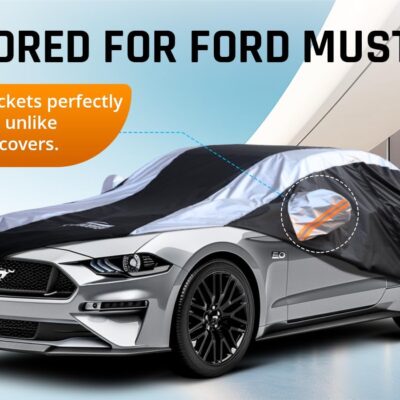 Mustang Car Cover Waterproof All Weather with Silver Strip Design, Custom Fit for Ford Mustang 1994–2025, Mustang Accessory with Door Zipper & Windproof Straps