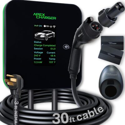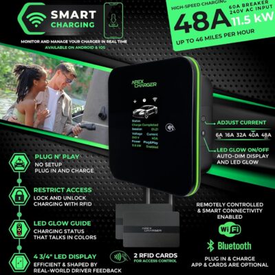 MACH 2:Fast Level 2 EV Charger 48 amp Garage-pro wall-Mount. Electric Vehicle Charging Station 4 Nema 14-50 Outlet. J1772 car Connector. Key Accessories: 30ft Cable & Tesla NACS evse Portable Adapter