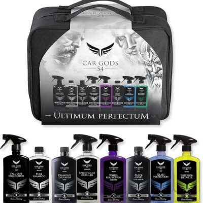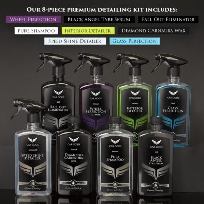 Car Gods 8 Piece Car Cleaning Detailing Kit – Shampoo – Carnauba Wax – Wheel Cleaner – Shine Detailer – Fallout Eliminator – Tyre Serum – Interior Detailer – Glass Cleaner