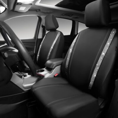 CAR PASS Leather Bling Diamond Car Seat Cover 2 Front Interior Sets, Waterproof Universal Shining Glitter Crystal Sparkle Fit for 95% Automotive Truck SUV Cute Women Girl, Black Silver Rhinestone