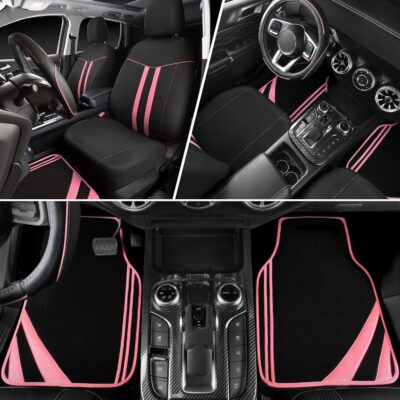 CAR PASS Car Seat Covers Full Set for Women Girls with Waterproof Car Floor Mats,Anti-Slip Leather Steering Wheel Cover,Universal Fit for SUVs,Vans,Trucks,Sedans,Cars (Combo Set,Black & Pink)