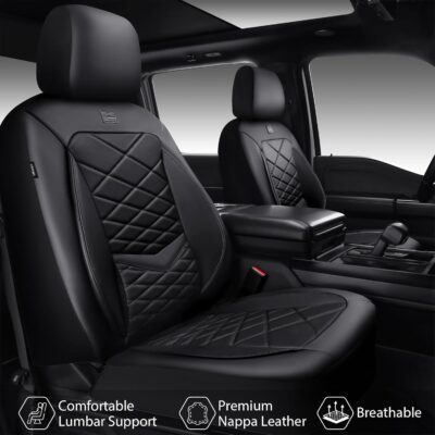 CAR PASS Luxury Nappa Leather Seat Covers Full Set, Water Resistant Faux Leather Seat Covers with Lumbar Support, Comfortable Automotive Seat Covers Universal Fit for SUV Sedan Van Truck, Solid Black