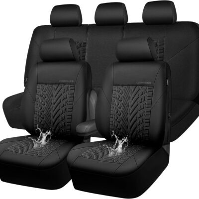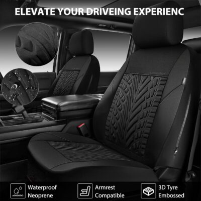 CAR PASS Neoprene Waterproof Seat Covers Full Sets, Wetsuit Car Seat Covers 5 Seats Universal Fit for Vans, Truck, SUV, 3D Tyre Embossed Seat Covers Anti Slip with Armrests, Aibag Compatible(Black)