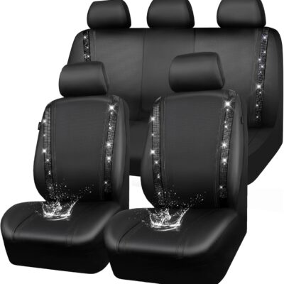 CAR PASS Leather Bling Diamond Car Seat Covers Full Set, Shining Rhinestone Waterproof Durable Rear with Zipper, Universal Fit Automotive Glitter Crystal Sparkle Strip for Cute Women Girly Black