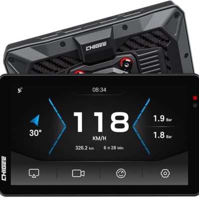 CHIGEE AIO-5 EVO Motorcycle Smart Riding System, Wireless CarPlay & Android Auto, Dual 1080P Front & Rear Dash Cam, Blind Spot Detection (BSD), 5″ Waterproof Display, Parking Mode