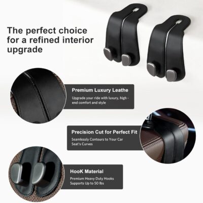 CoBak Purse Hook for Car – Universal Premium Stitched Leather and Aluminum-Magnesium Alloy Double Car Seat Back Storage Hook for Purses, Handbags, Bags (2 Pack),Black