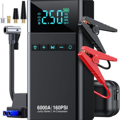 10-in-1 Portable Car Battery Jump Starter with Air Compressor, 6000A 160PSI Portable Car Jumper Starter (All Gas 12L Diesel), 12V Jump Box Car Battery Jump Starter with Jumper Cables, Lights