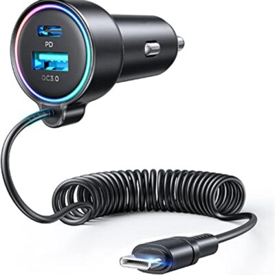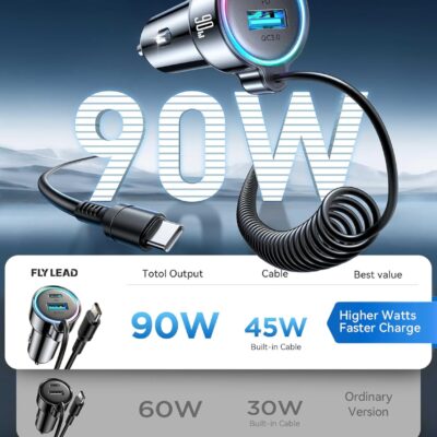 USB C 90W Car Charger for iPhone 17/16 Pro Max, PD & QC3.0 w/5 ft 45W Type Coiled Cable, Fast Car Phone Charger Adapter for iPhone 17Air/15 Pro, Samsung Galaxy S25/S24/S23, Pixel 10/LG/Android, iPad