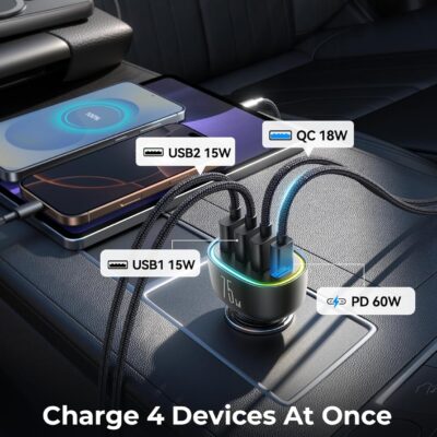 75W Car Charger USB C, 4 Port Super Fast Cigarette Lighter USB Charger, Type C 60W & QC 3.0 Multiport Car Phone Adapter Accessories for iPhone 17/16/15/14/13/12 Pro Samsung S26 Series