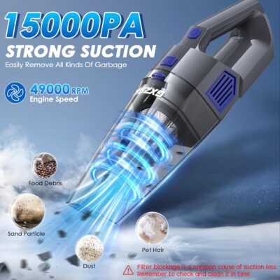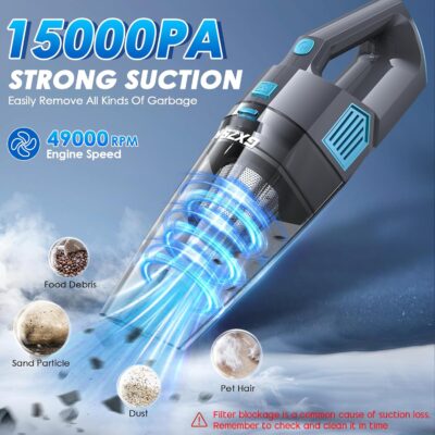 Handheld Vacuum Cordless, 15000PA Strong Suction Hand Held Car Vacuum Cleaner Rechargeable, Portable Hand Vacuum with Multi-Nozzles & Washable Filter for Home Office, Car, Pets