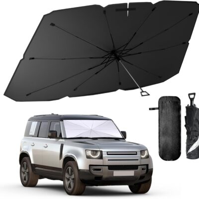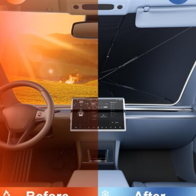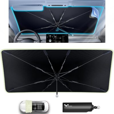 helloleiboo Car Windshield Sun Shade Umbrella 57″ x 32″, Windshield Sun Shade Foldable with 5-Layer Thickened Vinyl Coating Reflective Heat & UV Protection Fits Most Sedans & Compact SUVs