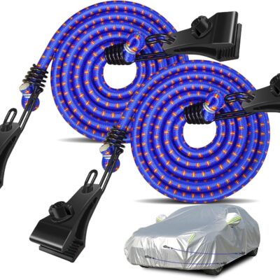 Hlogree 2PCS Car Cover Gust Straps Wind Protector,Bungee Cords Hook Clips Kit Hold Tarp Tie Down from Blowing Off in High Winds-Universal Fit for Most Cars,Sedans,SUVs,Trucks,Vans and More-Blue
