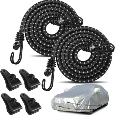 Hlogree 2PCS Car Cover Gust Straps Wind Protector,Bungee Cords Hook Clips Kit Hold Tarp Tie Down from Blowing Off in High Winds-Universal Fit for Most Cars,Sedans,SUVs,Trucks,Vans and More-Black