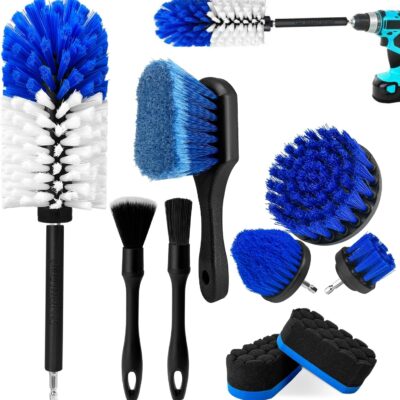 Wheel Brush Kit, Soft Drill Wheel Cleaner Brush, Tire Brush, Detailing Brush, and Detailing Pads, No Scratches Car Wheel Cleaning Kit for Wheels, Tire, Rims, Engines, Exhaust(Blue + White 9 Pk)