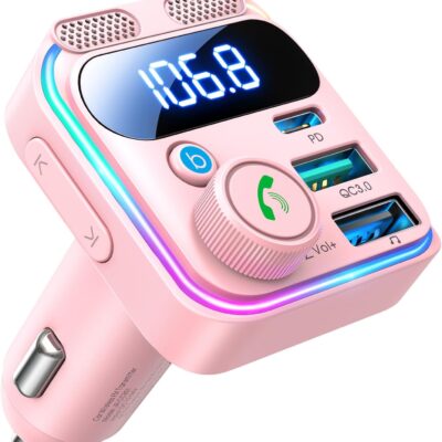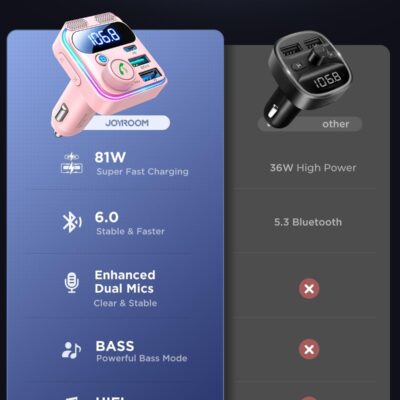 JOYROOM Bluetooth 6.0 Car Adapter FM Transmitter 81W Fast Charging Cigarette Lighter Hands-Free Calling Support USB Drive, Pink