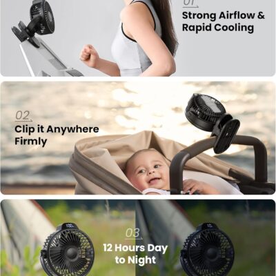 Koonie Portable Clip On Fan, Small Rechargeable Battery Operated, 3 Speed Mini clamp Fan With LED Display, 360° Rotate Personal Cooling Desk Fan for Stroller Bed Travel Camping Golf Gym