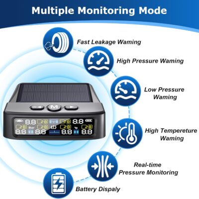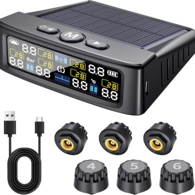 RV Tire Pressure Monitoring System -TPMS Tire Pressure Monitor with 6 Sensors,M12-3 TPMS Solar Charge & USB Color LCD Display, 0-9.9BAR/144PSI Range, 6 Alarm Modes for RV/Trailer/Truck IP67
