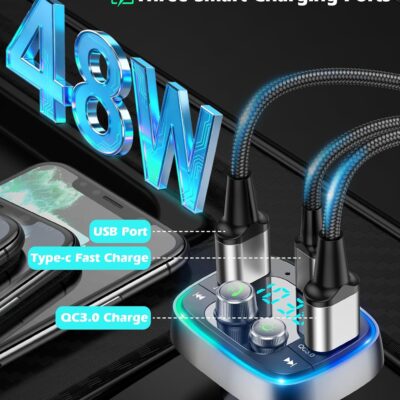 LIHAN USB C Bluetooth 5.4 Car Adapter, Wireless Upgrade Audio System for Non-Bluetooth Vehicles, FM Radio Transmitter, 48W Fast Charging, Stable Hands-Free Calling, MP3 Music Player, Support USB/TF