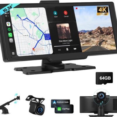 Portable Apple CarPlay Screen for Car, 10.26“ Wireless CarPlay & Android Auto Touch Screen Voice Control Navigation, 4K Dash Cam & 1080P Backup Camera DVR Recording Plug & Play for Car Truck