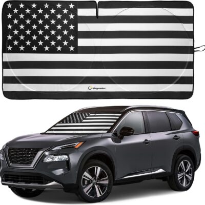 American Flag Windshield Sun Shade, High-Resolution Car Sun Shield with Mirror Cut-Out for Automotive Interior Sun and Heat Protection, Folding Sunshade with Storage Bag – Medium, Black & White
