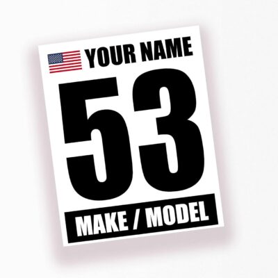 MC MOTOPARTS Magnetic Racing Number – Custom Track Day & Autocross Magnetic Vinyl Decal – Name, Make, Model, Flag – 2 Pieces | Black Words on White Background | 12″ x 15″ Inch