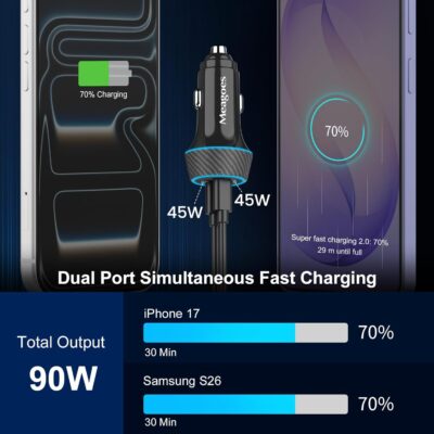 USB C Car Charger, Meagoes 4 Ports 90W Super Fast Charging, Dual 45W USBC & QC3.0 USB 12V Cigarette Lighter Adapter for iPhone 17 Air 16 15 iPad Tablet Google, Samsung S26 Android Type C Cell Phone