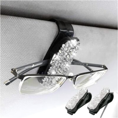 Moly Magnolia 2 PCS Glasses Holders for Car Sun Visor, Fashion Bling Crystal Rhinestones Car Eyeglasses Sunglasses Hanger Mount with Ticket Card Clip for Women Girls (Silver)