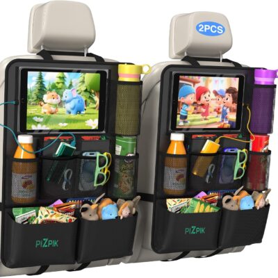Car Backseat Organizer with Tablet Holder,11 Storage Pockets with Foldable Food Tray, Protector Kick Mats for Kids, Travel Accessories Organizer (Black, 2-Pack)