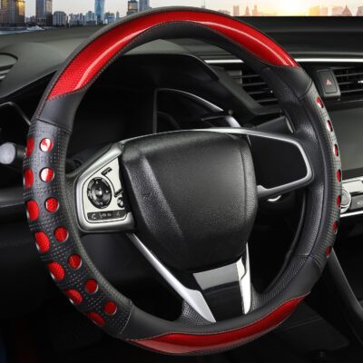PU Leather Car Steering Wheel Cover with Anti-Slip Grip, for Women and Men, Universal Fit for 14.5-15 Inch Cars, Trucks, SUVs (Red (Round), Medium(Standard) Size[14 1/2”-15”])