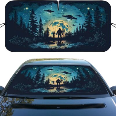 Bigfoot Alien Car Windshield Sunshade – Folding Moon UFO Trees Heatshield Front Window Sun Shade Visor Protector for Sedan Truck SUV – 59″ L x 31.5″ W
