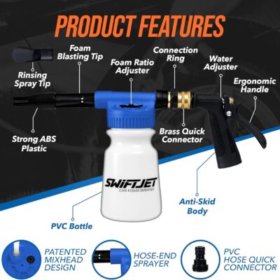 SwiftJet Car Wash Foam Gun + Microfiber Wash Mitt – Foam Cannon Works with Any Soap – Garden Hose Car Foam Sprayer – Car Wash Kit – Car Accessories Foam Blaster (Blue Foam Gun with Mitt)