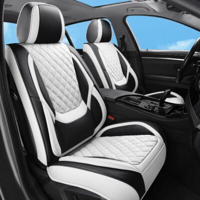 Car Seat Covers Full Set, Luxury Leather Waterproof Non-Slip Seat Protector Universal Fit for Most Cars SUVs Trucks Pick-ups,White and Black Car Accessories Interior(Full Set White)