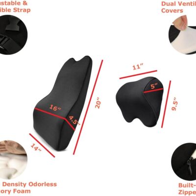 Tektrum Orthopedic Entire Back Support Full Lumbar Cushion for Car & Headrest Neck Pillow Kit – Ergonomic Thick 3D Design Fit Body Curve – Back, Neck Pain Relief, Improve Posture -Black (012011-A)