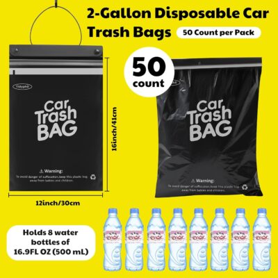 50 PCS Disposable Car Trash Bags Hanging, Leak-proof, Odor Seal. 2 Gallon Car Garbage Bags, Big Capacity. Independent of Car Trash Can, Easy Stick-On Car trash Bin for Car, SUV, Truck, Stroller. Black