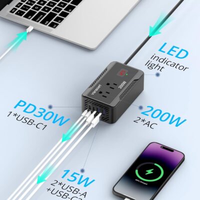 200W Car Power Inverter DC 12V to 110V AC Converter with [PD 30W & 15W] Fast Charging USB C/3.0A Dual USB Charging Ports, Car Outlet Adapter for Phone, Laptop on Road Trip (Black)