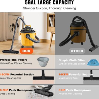 VEVOR 5 Gallon 6.0 Peak HP Wet and Dry Shop Vac, Portable Shop Vacuum and Blower 3-in-1 with Filter, Hose and Attachments for Home and Car Cleaning Black/Yellow