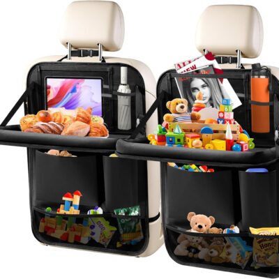 2Pack Car Backseat Organizer with Foldable Table Tray,6 Storage Pockets Car Storage Organizer with Tablet Holder,Car Seat Back Protectors Kick Mats Travel Accessories (Black)