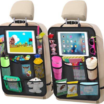 Car Backseat Organizer ,2 Pack Car Organizer Back Seat with 11″ Tablet Holder, 10 Storage Pockets Seat Back Protectors Kick Mats for Kids Toddlers, Travel Accessories (Black)