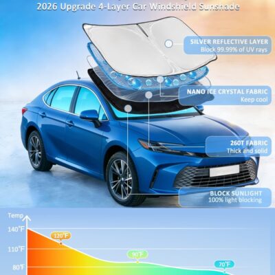 Windshield Sun Shade for Toyota Camry 2025 2026 LE XLE Hybrid SE XSE – 4 Layers Car Sunshades for Front Windows Shade Cover Custom Fit Camry Sun Visor 250T Retractable Blocks Shade UV Rays Accessories