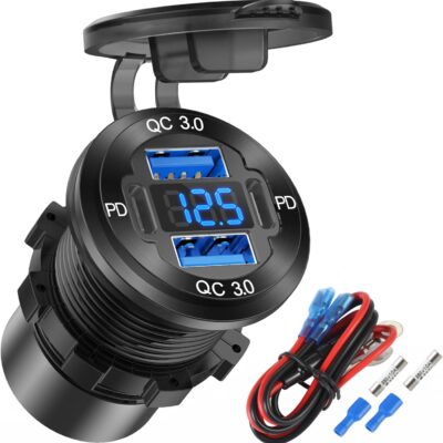 Upgraded 4 Port 12V USB Outlet Aluminum Charger, 78W Dual PD & QC Multiple USB Port for Car, USB C Cigarette Lighter Replacement 12 Volt Socket with Voltmeter Waterproof for Marine Boat Motorcycle RV