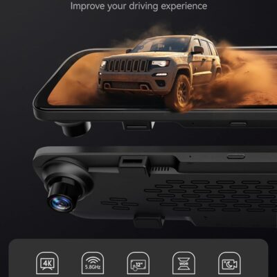 WOLFBOX G840S 12″ 4K Mirror Dash Cam Backup Camera, 5.8GHz WiFi Smart Rearview Mirror for Cars & Trucks, Front and Rear View Dual Cameras, Night Vision, Parking Assistance, Included 32GB Card & GPS
