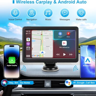 Wireless CarPlay Screen for Car, 7″ HD Portable Stereo Touchscreen with Apple CarPlay & Android Auto, CarPlay Screen with Backup Camera, Mirror Link, Bluetooth, Navigation for All Vehicle