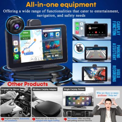 Wireless Apple CarPlay with Dash Cam: 7″ Carply Screen for Car with Backup Camera – 5-Min Plug-and-Play Upgrade for Older Cars – GPS Navigation, Bluetooth, Siri Voice Control