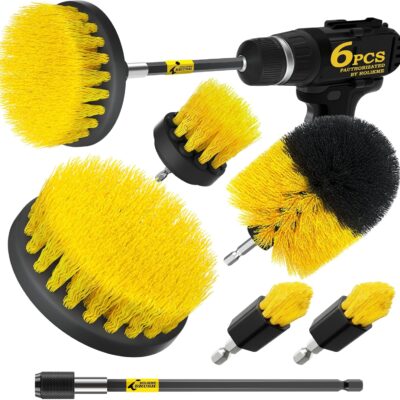 Holikme 6Pack Drill Brush Power Scrubber Cleaning Brush Extended Long Attachment Set All Purpose Drill Scrub Brushes Kit for Grout, Floor, Tub, Bathroom and Kitchen Surface,Scratch Brushes(Yellow)