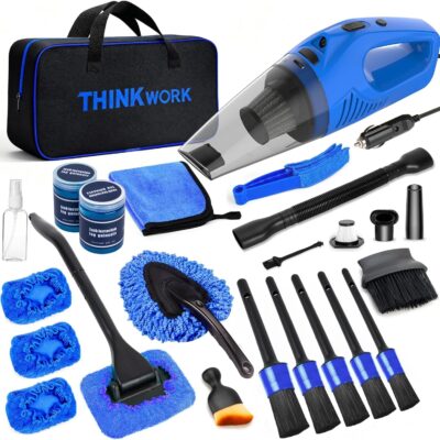THINKWORK Car Cleaning Kit Car Detailing Kit,Car Cleaning Kit Interior Cleaner with High Power Blue Handheld Vacuum Cleaner,Brush Sets,Windshield Cleaner and Storage Bag,Car Accessories,Car Gift Set
