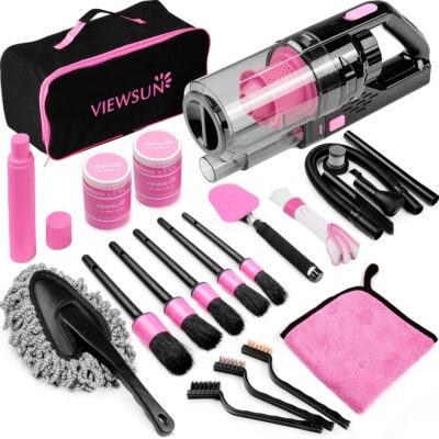 Viewsun 17pcs Car Cleaning Kit, Pink Car Interior Detailing Kit with High Power Handheld Vacuum, Detailing Brush Set, Windshield Cleaner, Cleaning Gel, Complete Auto Accessories for Women Gift