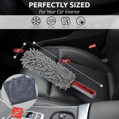 Car Duster Interior by TAKAVU, 360° Microfiber Fingers, Unbreakable Comfort Handle, Lint and Scratch Free, Include Microfiber Towel, for Car & Home Use, The Best Auto Accessories Gray