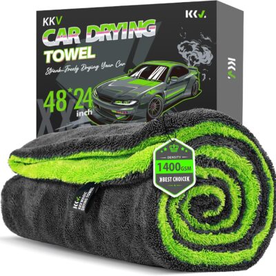 KKV Full-Sized SUV Drying Towel, 48”x24” Dual Sided Microfiber Car Cleaning Towel with Twisting Yarn Technique, 1400GSM Super Absorbent, Scratch-Free, Machine Washable (Darkgray-GreenYellow)